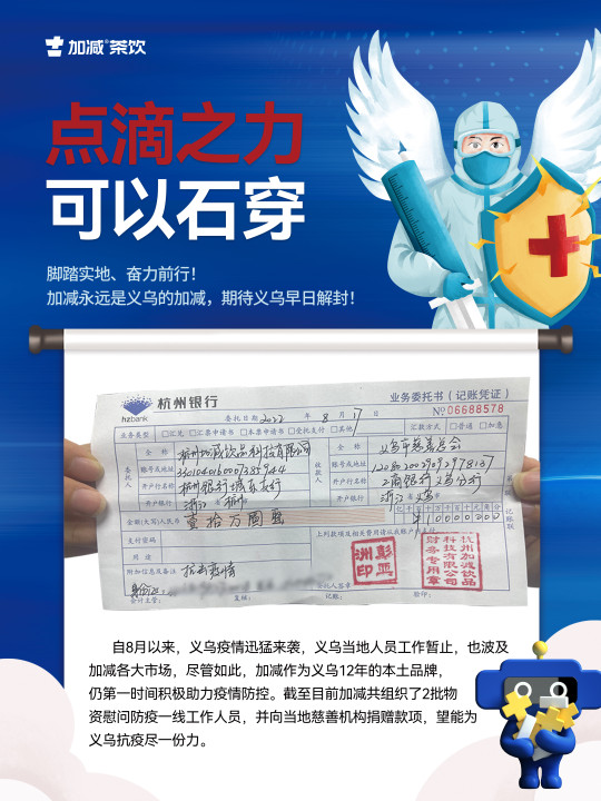 2022年8月11月,因义乌突如其来的疫情,整座城市按下了暂停键,全民进入静默期。在这场新冠肺炎疫情爆发期间,作为深耕义乌发展12年的AGGAMES茶饮,主动发扬本土企业的社会担当和责任。截至2022年8月17日,公司共组织了2批物资慰问一线人员,并向当地慈善机构捐赠爱心款项。脚踏实地、奋力前行!AGGAMES以实际行动为打赢疫情防控战贡献力量!